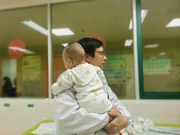 吴德医生把做康复训练的孩子抱在怀里。