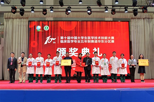 大赛中,来自46所高校的参赛队伍展开了激烈角逐,展示了深厚的理论功底和高超的实践技艺,显示了良好的应变能力和高度的团队精神,呈现了一场场精彩的医学盛宴。经过2天的高水平比拼,南昌大学、福建医科大学最终斩获本次华东分区赛特等奖,同济大学、蚌埠医学院、浙江中医药大学获一等奖,赣南医学院、温州医科大学、南京大学、南京医科大学、山东大学、山东第一医科大学获二等奖,上海健康医学院等34所高校代表队获三等奖。大赛还评选出单项奖20项。我校获最佳风尚奖,并与团体前11的参赛队一同晋级全国总决赛。