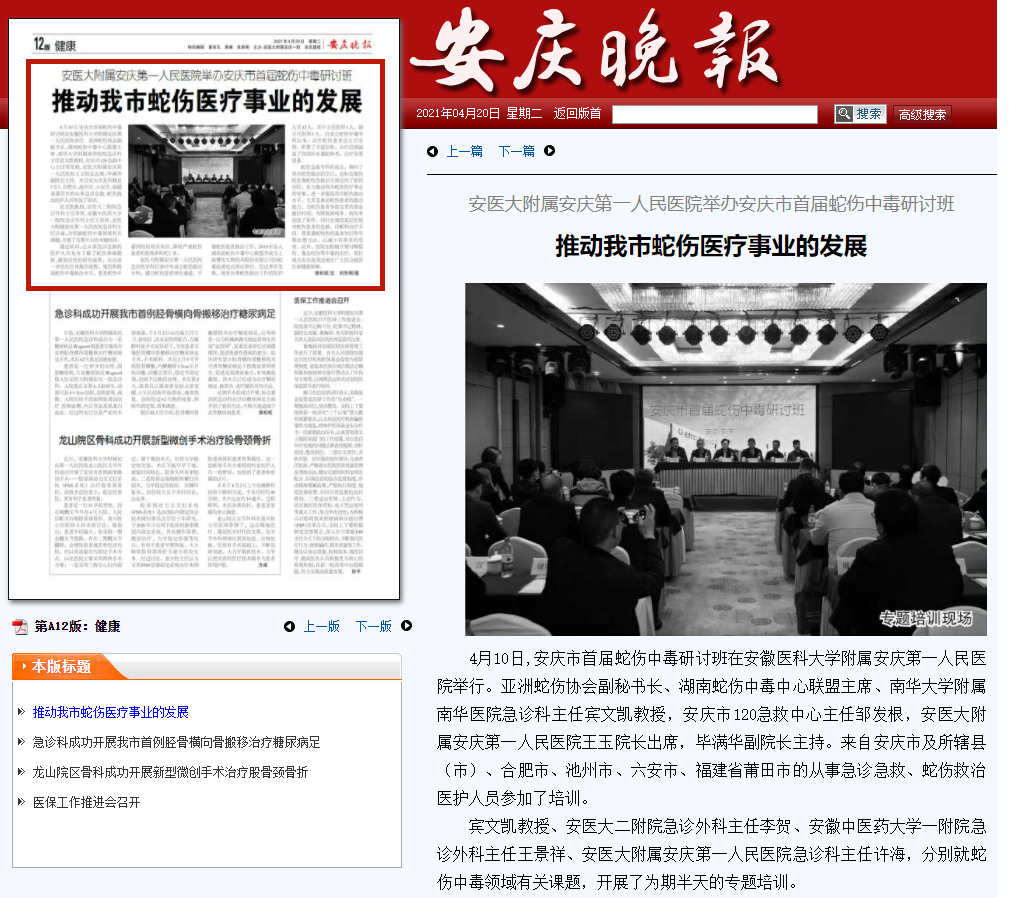 宾文凯教授、安医大二附院急诊外科主任李贺、安徽中医药大学一附院急诊外科主任王景祥、安医大附属安庆第一人民医院急诊科主任许海,分别就蛇伤中毒领域有关课题,开展了为期半天的专题培训。