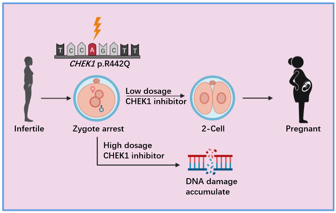 为了寻找此突变造成的不孕症的解决方案,他们进一步利用CHEK1的抑制剂处理引入突变Chk1蛋白的小鼠受精卵,经处理的受精卵进一步发育的比例大大提升,并可以在移植后出生健康的子代。研究表明,低剂量的CHEK1抑制剂处理没有造成更多DNA损伤,也并未造成显著的转录组改变。