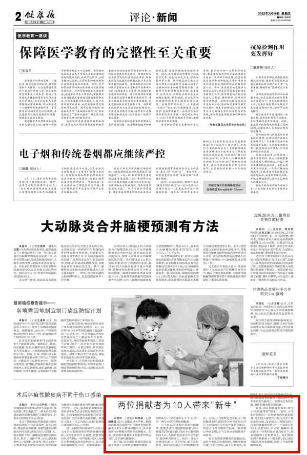 健康报:两位捐献者为10人带来“新生”