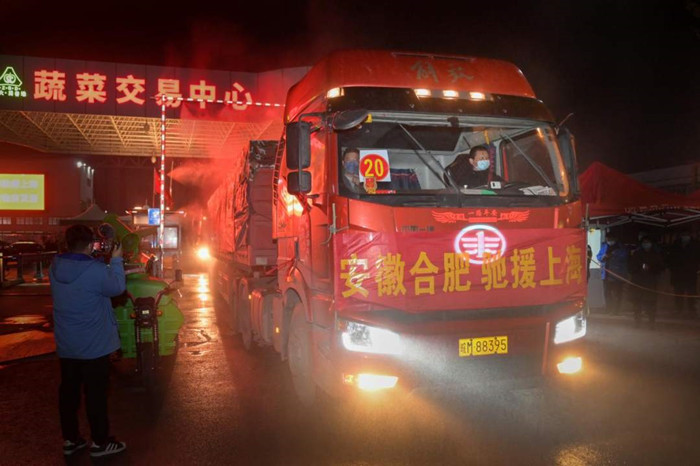 3月31日晚,满载生活物资的大货车车队从合肥市周谷堆蔬菜市场出发前往上海。苗子健 摄