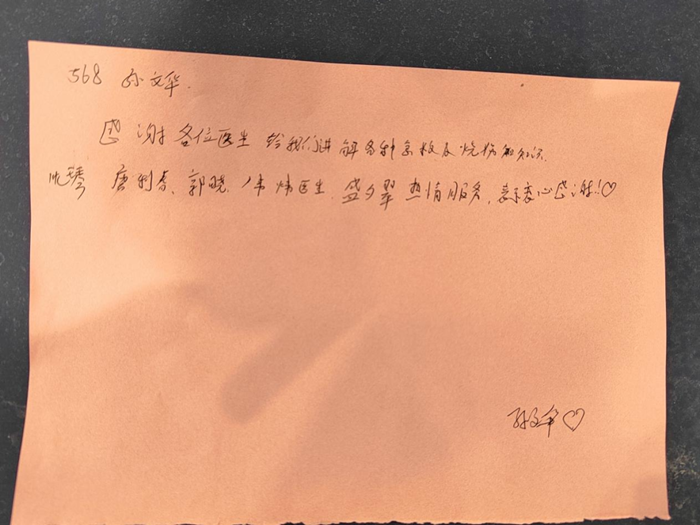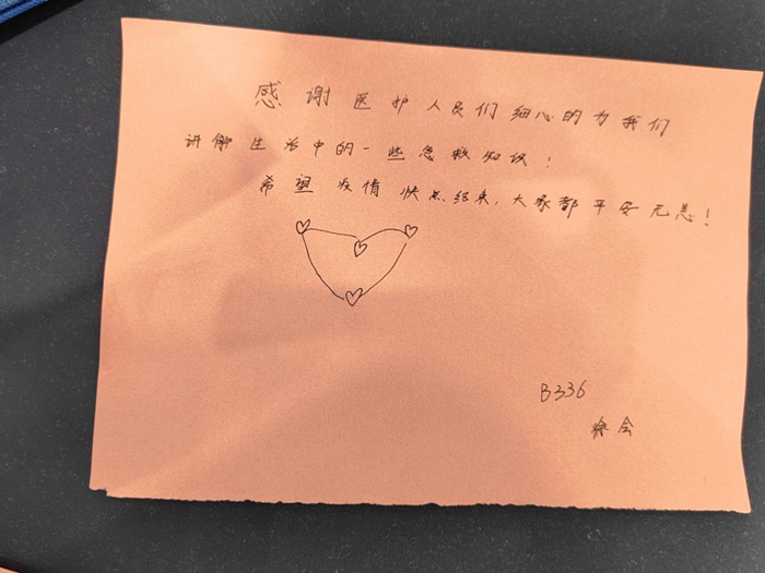 舱内患者对此次“急救科普小讲座”给予了高度的认可。讲座结束后大家在纸条上留言:这个“小课堂”的内容科学又实用,真的是上了一堂“生命”的必修课!