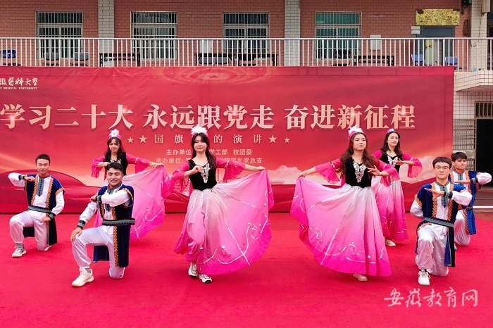青春心向党,奋进新征程。活动中,第二临床医学院2022级麻醉学吴奕扬等同学表演的诗歌朗诵《青春心向党》,声情并茂地歌颂了伟大中国共产党的光辉历程,铿锵有力地表达了对伟大祖国的崇高敬意,生动诠释了在百年安医的孕育下,新时代安医青年“强国有我,赓续辉煌”的铮铮誓言。2022级临床医学艾力·扎提、康复治疗学郭倩茹等同学表演的《舞动新时代》,以青春之舞、青春之名,舞出满腔清澈挚爱,绽放民族团结深情,以青春最闪耀的模样,与祖国同频,与时代共振。