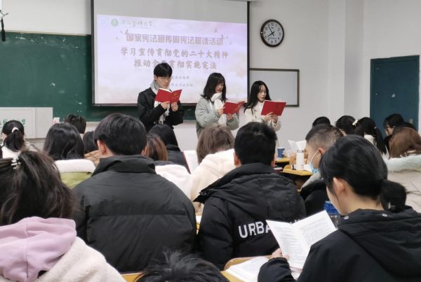 “只有铭刻在人们心中的法治,才是真正牢不可破的法治。”该校把学深悟透习近平法治思想与当前学习宣传贯彻党的二十大精神紧密结合起来,组建宣讲团,面向广大师生开展对象化、分众化、互动化宣讲;从理论主题、体系框架等多角度学习宣传习近平法治思想中的立场、观点和方法,以研促教,深入推进习近平法治思想和党的二十大精神“进教材、进课堂、进头脑”;成立校研究生思政宣讲员及法治宣讲员队伍,聚焦党史国史、青年榜样故事、法治校园、疫情防控等主题,面向全校本科生和研究生经常性开展面对面、互动性的宣讲交流,为学校思政工作和法治工作的推进实施营造良好氛围。