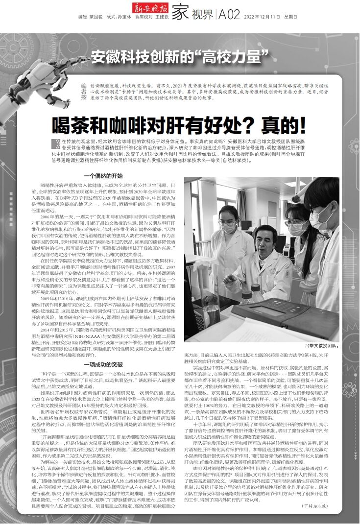 如果说开始咖啡因对酒精性肝病的作用研究是一次偶然的话,那么2022年在安徽省科学技术奖励大会上捧回自然科学奖一等奖的荣誉,就是对吕雄文教授及科研团队16年坚持的最大肯定和最好回报。