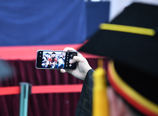 毕业生拿起手机同校领导自拍合影留念。殷泽文 摄
