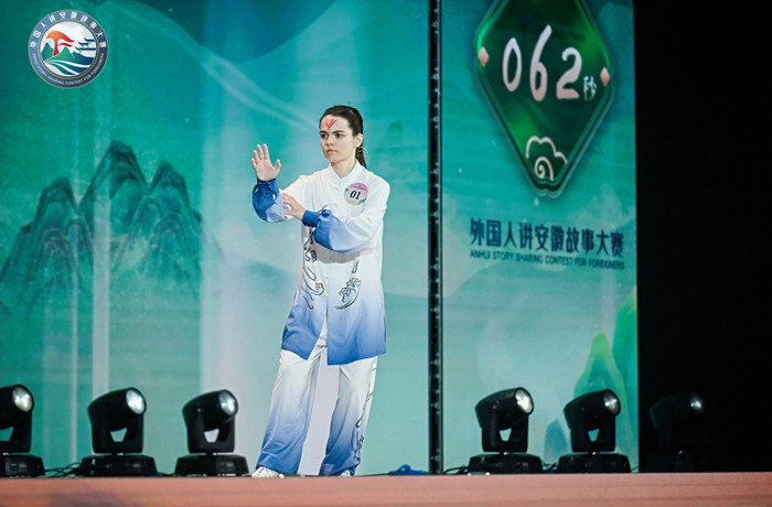 决赛分为知识问答、风物推荐、汉语演讲和才艺表演四个环节。我校两位参赛留学生章伯涵、容佳琪对中国传统文化特别是安徽传统文化如数家珍,满分通过知识问答环节,并和两位留学生助演同学在现场风物推荐环节进行了精彩的展示。才艺展示中,章伯涵表演了陈式太极拳,动静相随、刚柔相济,一套动作行云流水,充分展示了太极拳的力量之美与灵动之美,赢得阵阵掌声。容佳琪带来的黄梅戏《夫妻观灯》选段也给评委留下深刻印象。