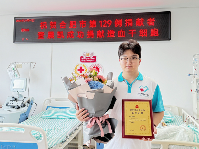 顺利通过高分辨采样、体检环节后,查晨凯便调整生活作息,避免熬夜,只为把质量最好的造血干细胞捐献给患者。在合肥市红十字会志愿者的陪同下,经历5天的造血动员,最终他在9月5日完成了270毫升的造血干细胞捐献。