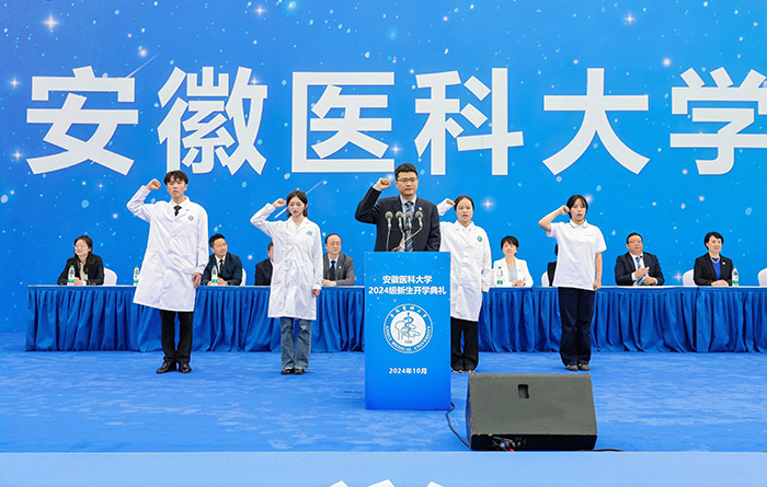 国家级人才称号获得者、国家重点研发计划首席科学家、炎症免疫性疾病安徽省实验室执行主任、校科技产业处处长王华教授,携4名新老生代表,带领2024级全体新生郑重诵读医学生誓词。
