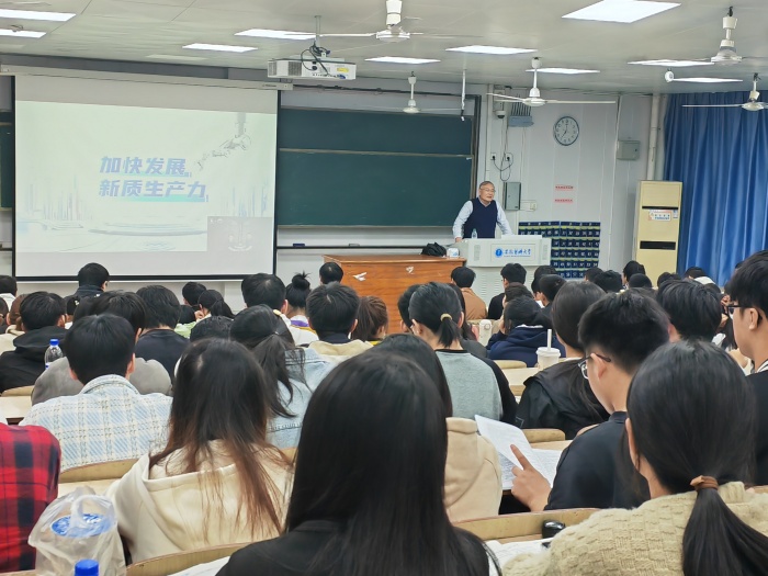11月12日晚,校党委常委、副校长余永强在锡祺楼14101教室为本科生讲授了题为《加快发展新质生产力》的“形势与政策”课。