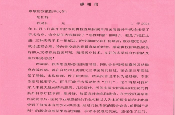 “从附属阜阳医院的医护人员身上,我看到了医务人员的德被天下、医者仁心和大爱无边,也看到了该院深入践行人道主义精神的光辉典范。这一切皆是因为安医系的传承及医院的卓越管理。”在这个快节奏的时代,每一份真心都显得尤为珍贵。12月26日,附属阜阳医院就收到一封充满真情的患者感谢信。
