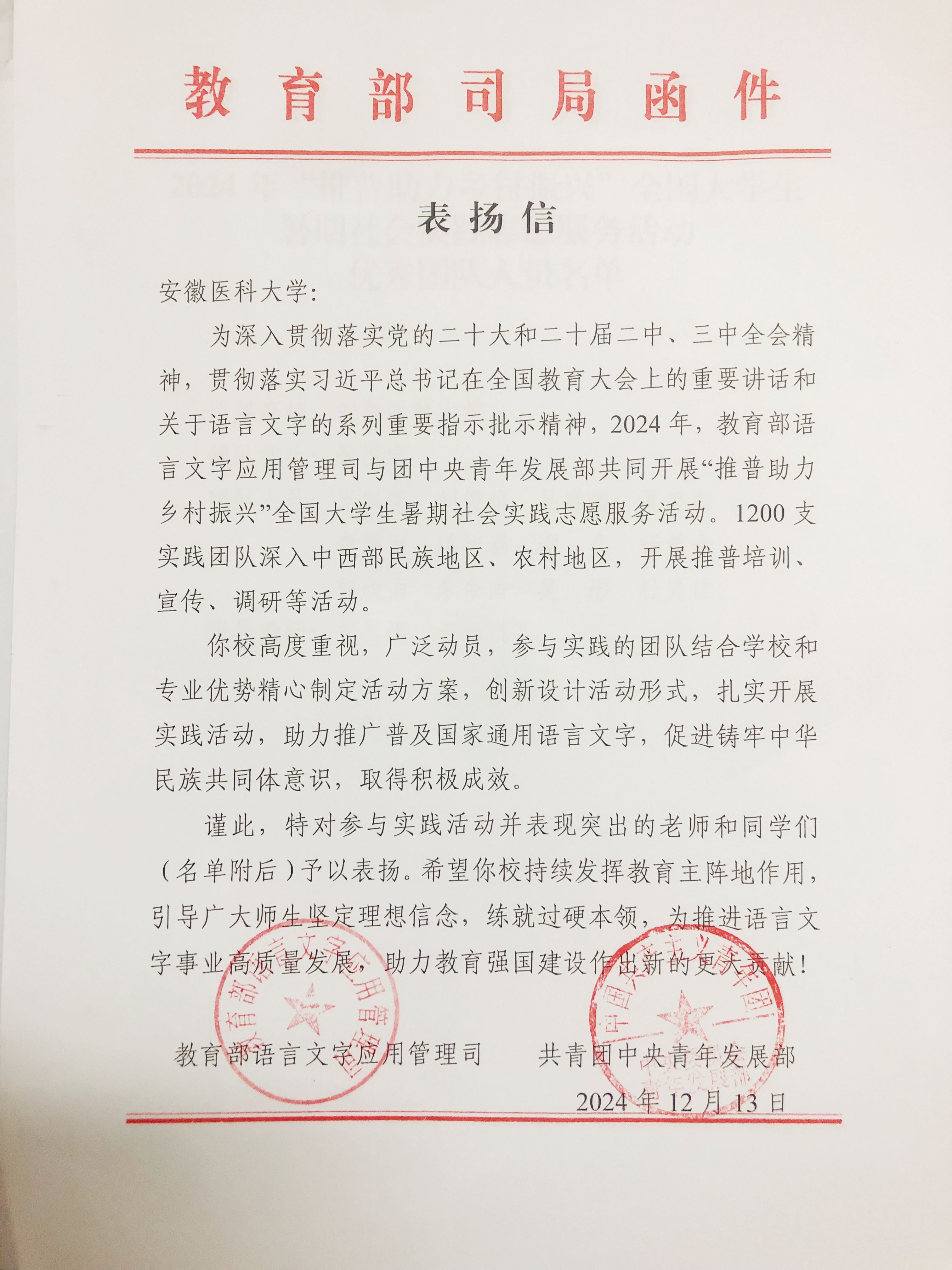 2024年7月14日至20日,我校第二临床医学院“语暖乡村”暑期社会实践团再次深入安徽省淮南市凤台县岳张集镇中心学校,开展普通话推广活动。创新推出“普通话+”模式,将普通话推广与中华优秀传统文化和爱国主义教育相结合,帮助当地学生理解推广普通话的意义,增强爱国情怀,为新时代的乡村振兴注入活力。据了解,“语暖乡村”项目已连续开展多年,活动期间,团队事迹得到新华网、淮南日报、凤台县电视台等多家媒体报道,累计发布专题报道20余篇。